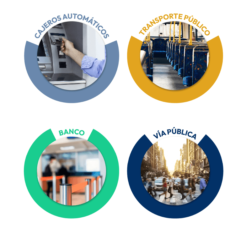 Los lugares en los que la gente se siente menos segura son los cajeros automáticos, el transporte público, el banco, la calle y la vía pública. Estos son lugares comúnmente utilizados por los ciudadanos todos los días.